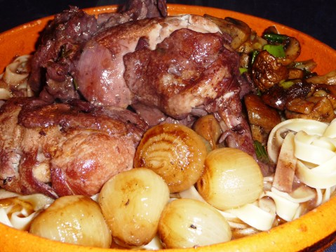 10. Return the chicken to the sauce to reheat. The onions and mushrooms can be added to the sauce or served on the side. I prefer to serve coq au vin over a pasta such as tagliatelle, but it would probably also go very well with mashed potatoes.