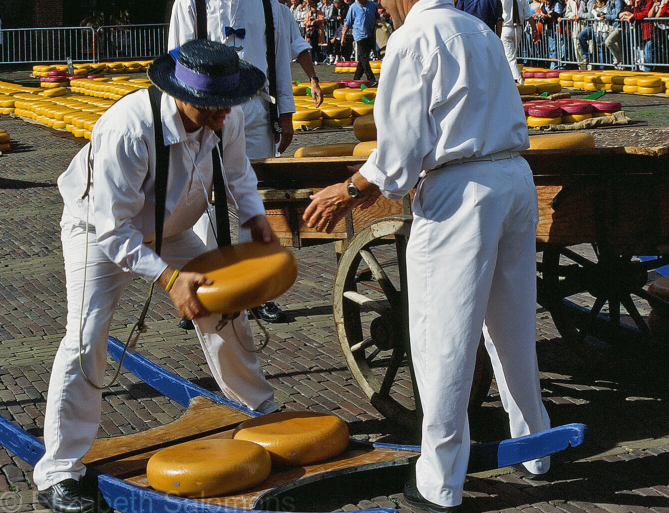 Then the cheese is loaded onto the carts and carried away to the trucks that bring it to the buyers’ warehouses.
