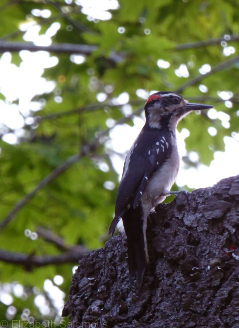 This is a Hairy Woodpecker. He’s not that big, but he sure makes a lot of noise for his size. He was busy making himself heard on the wildlife tree in my friend’s front yard, so I walked over to introduce myself.