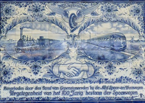 I was especially intrigued by this plaque in Delfts Blauw tile on one of the walls in the Haarlem station. It’s from 1939 and commemorates 100 years of Dutch rail service. Train buffs know that the 1840s were the tech boom of the nineteenth century — railway lines were being laid down all over the place. In Canada, too.