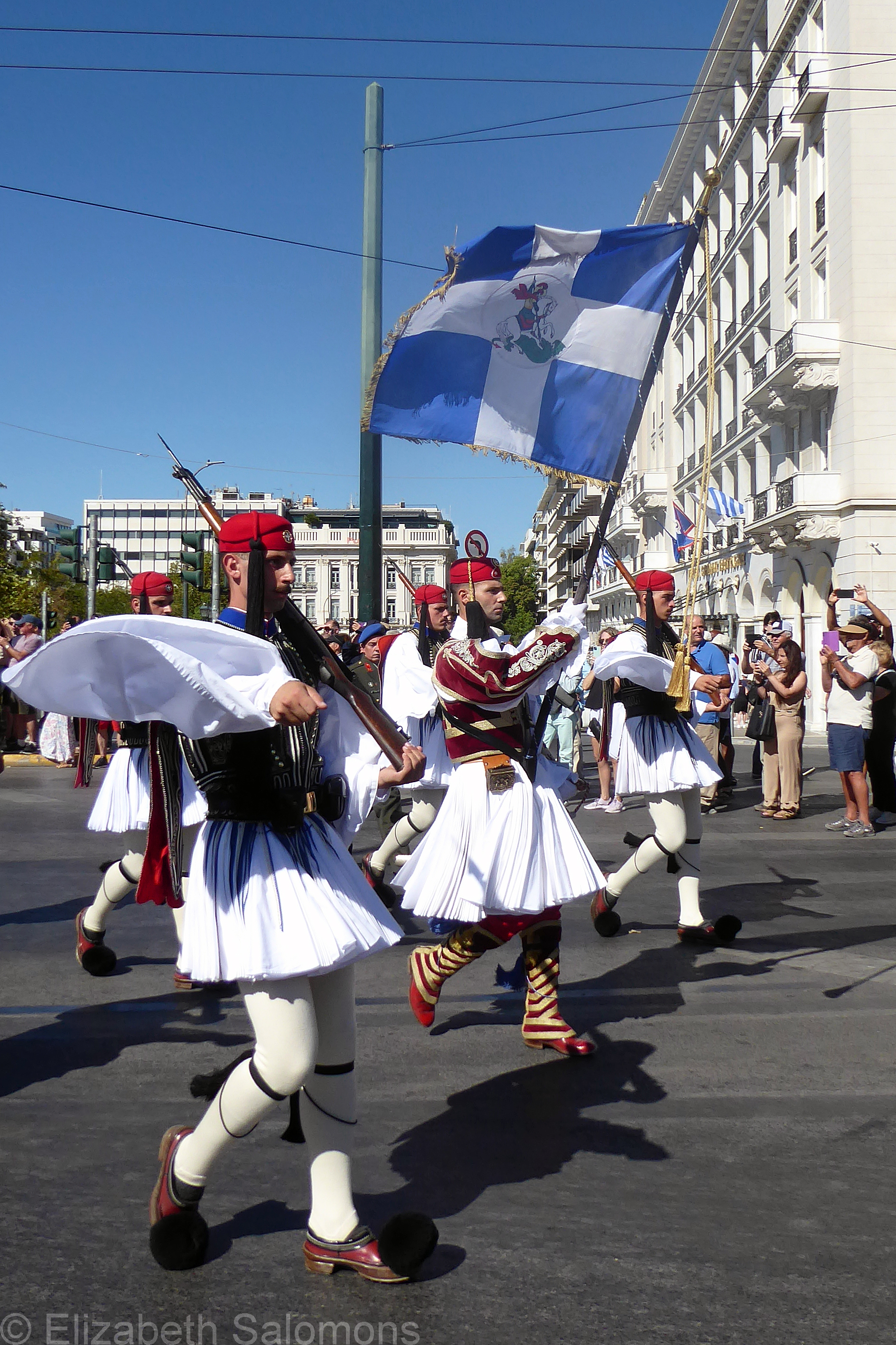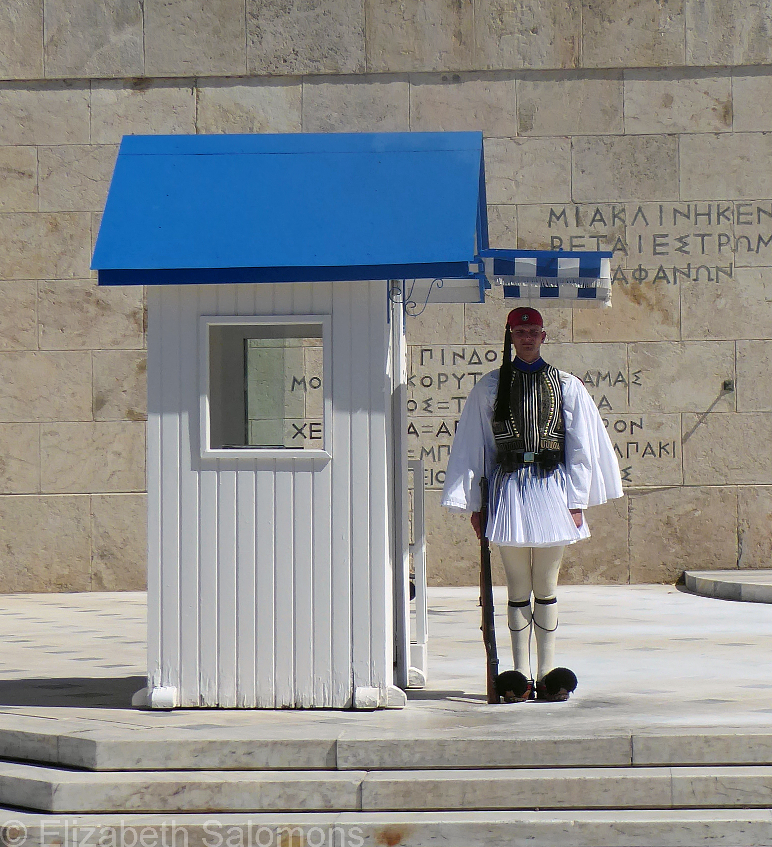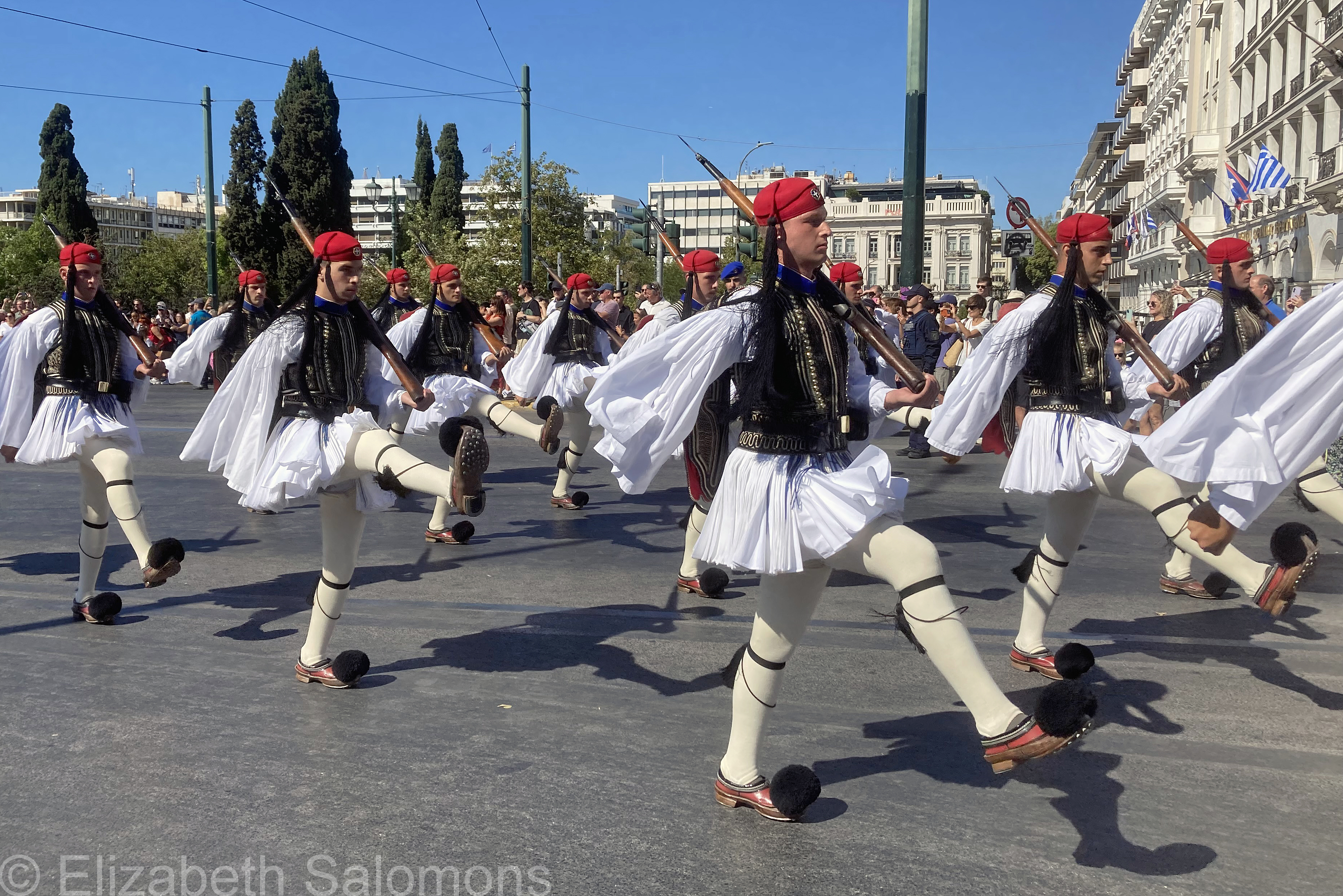 The vest takes the most time to make as it involves intricate embroidery. The red cap symbolizes the blood spilled by the soldiers, and the black tassel symbolizes the tears shed in mourning. The shoes are handmade and based on footwear worn since Byzantine times. The distinctive pompom was originally added to help make the toe waterproof.