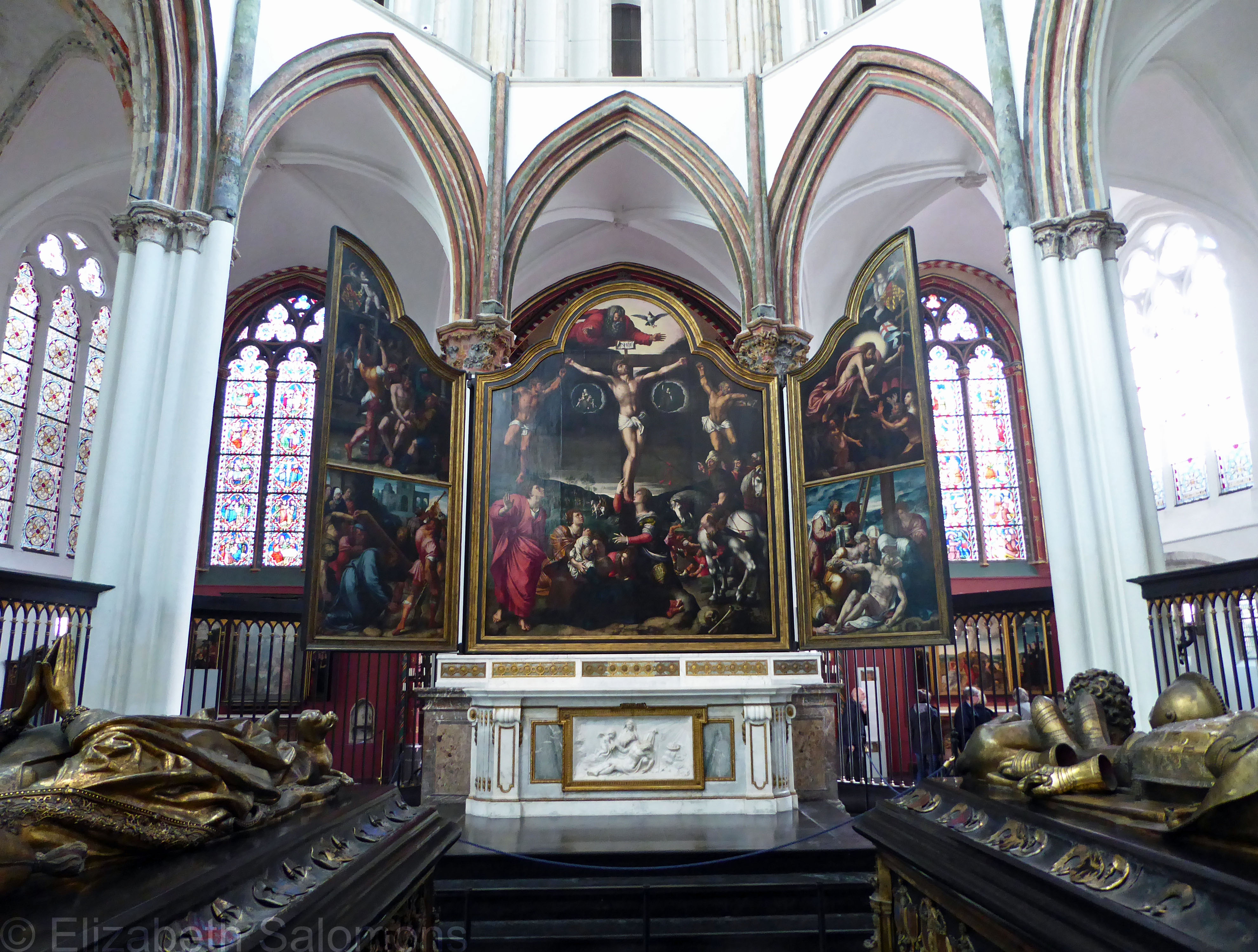 Note the tombs flanking the altar. They belong to Mary of Burgundy and her father, Charles the Bold, Duke of Burgundy. Upon her father’s 1477 death at the Battle of Nancy, Mary became the Duchess of Burgundy and ruled until her death due to a riding accident at age 25.