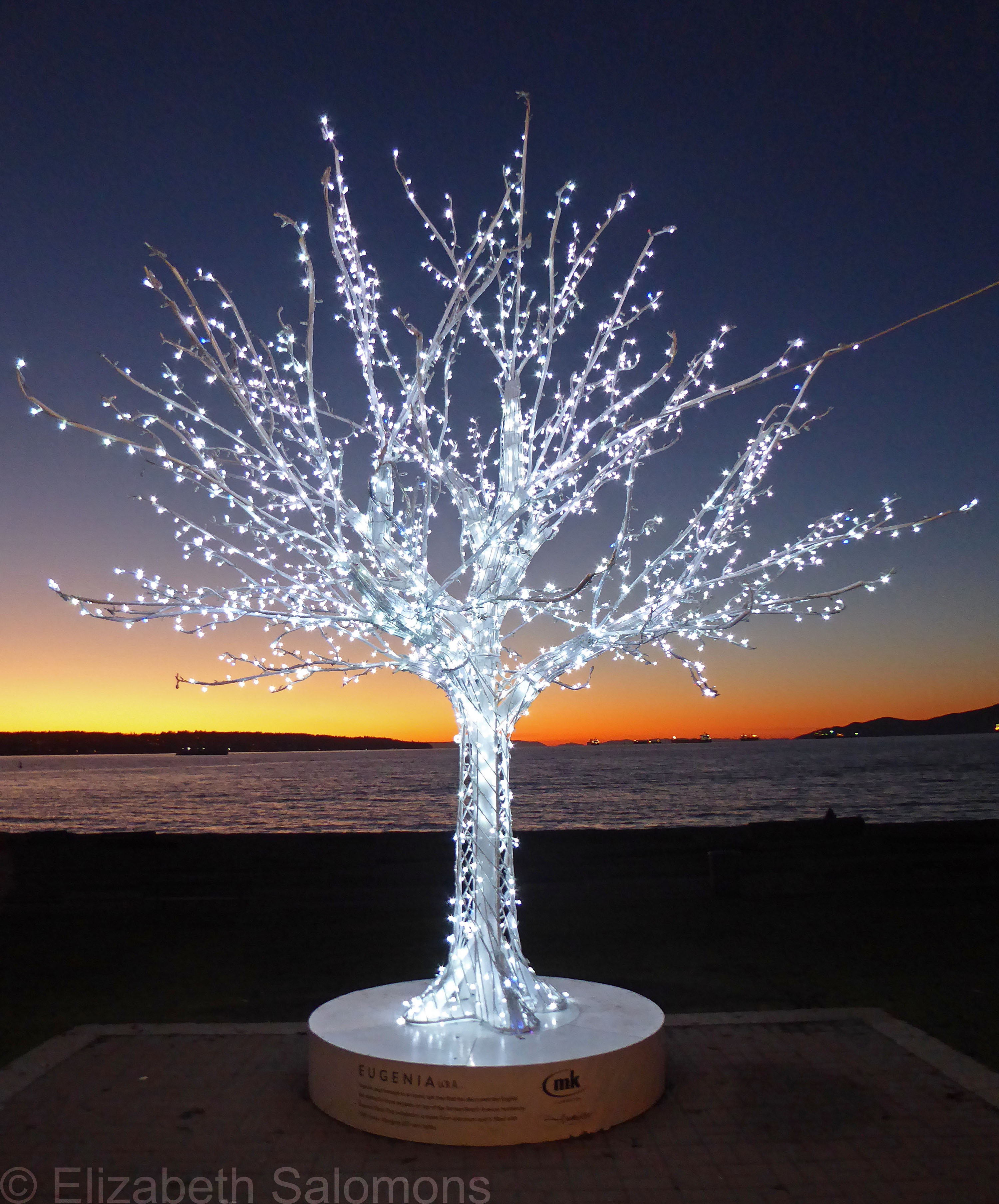 This is Eugenia, another of the sculptures that light up English Bay this time of year. She’s named for Eugenia Place, an iconic condo building along Beach Avenue that stands out because of the oak tree that stands tall on its roof deck.