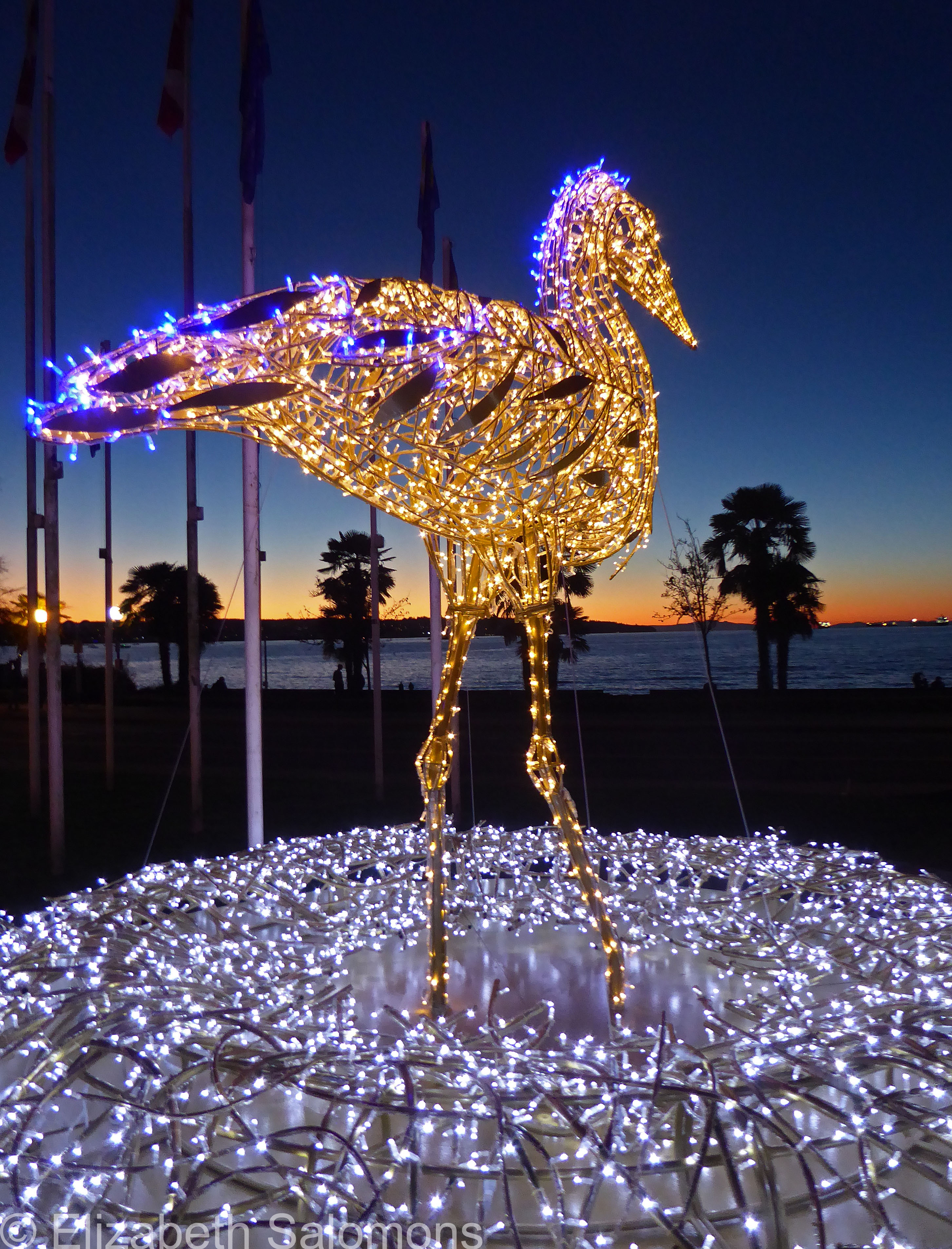 Stanley is named after Stanley Park, home to one of the largest urban Great Blue Heron colonies in North America. He stands four metres tall and is made of more than 10,000 lights.