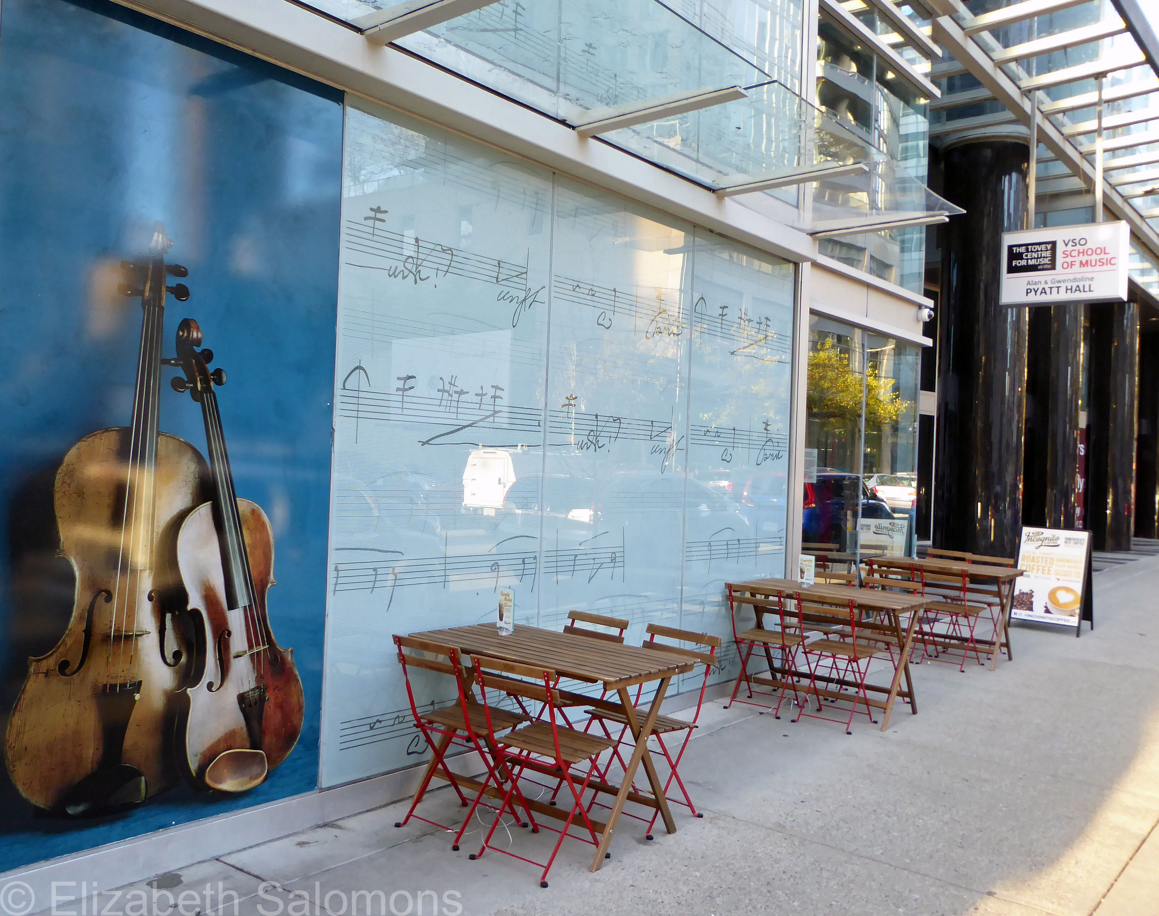 The glass mural in the above photo is a facsimile of Beethoven’s original score for the chorale Ode to Joy. The mural is on the façade of the Vancouver Symphony Orchestra’s School of Music, located next door to the Orpheum, the VSO’s concert hall.