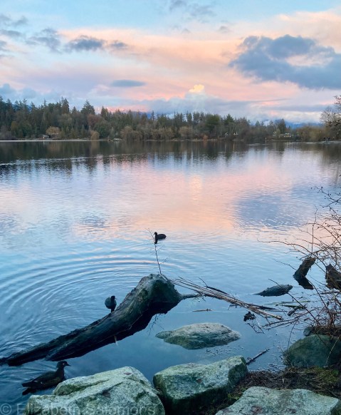 I can believe it. But yesterday, when the sun (finally) came out and I got myself over to Lost Lagoon, all I saw was pink. I took this photo a few minutes after the sun went down.