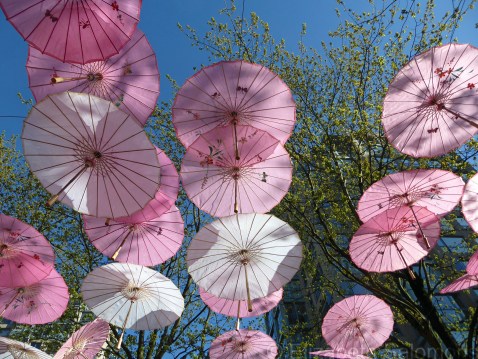 To celebrate the season this year, another public art installation was put up in the same square as last year’s Underbrellas. I don’t know what this year’s umbrellas are called, but I’m calling them the pretty pink parasols.