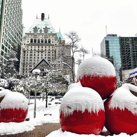 This is Eugenia, another of the sculptures that light up English Bay this time of year. She’s named for Eugenia Place, an iconic condo building along Beach Avenue that stands out because of the oak tree that stands tall on its roof deck.