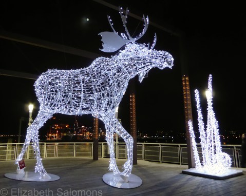 Some friends and I went out for drinks the other night at one of the hotel bars near the waterfront. When we finished imbibing, we took a walk along Canada Place to check out the light displays and so I could take some photos. That’s an almost-full moon just to the left of the moose’s antlers.