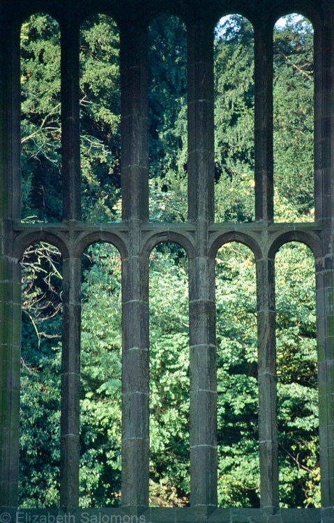 For Palm Sunday, I’m posting a photo of a wall of windows from Fountains Abbey. These windows are located on the bottom level of the abbey’s tower, which was built not long before the abbey was surrendered to the Crown. As I explained last Sunday, after the surrender, the lead and glass were removed from all of the abbey’s windows, allowing in the elements and causing the abbey to quickly fall into ruin.