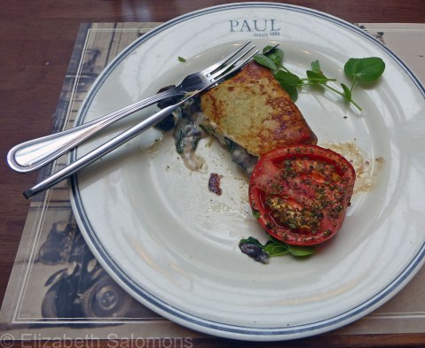 You have to suspend disbelief to think you are in Paris, though. Although my crêpe aux champignons et aux épinards (mushroom and spinach crepe) was excellent, the size of the pastries we perused in the display case on our way out were supersized, not small and delicate the way they are in French bakeries. And the seating area was light and airy with tables quite far apart, not squished together as they are in Parisian cafés.