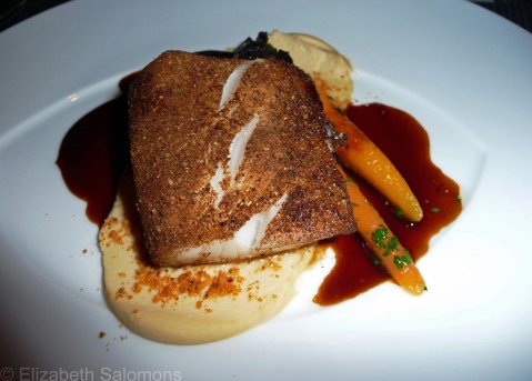 The second course was Moroccan spiced black cod, with chick peas, cashews, and black trumpet mushrooms. I’ve never had cod so delicate and light. The black trumpet mushrooms were the perfect accompaniment, as was the 2010 Pinot Gris from Penticton’s Poplar Grove winery.